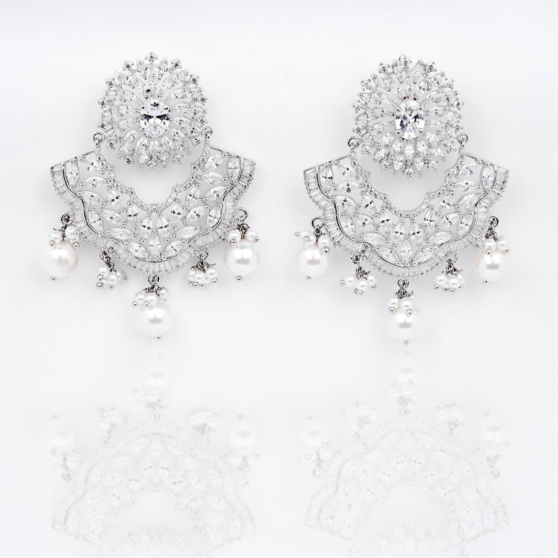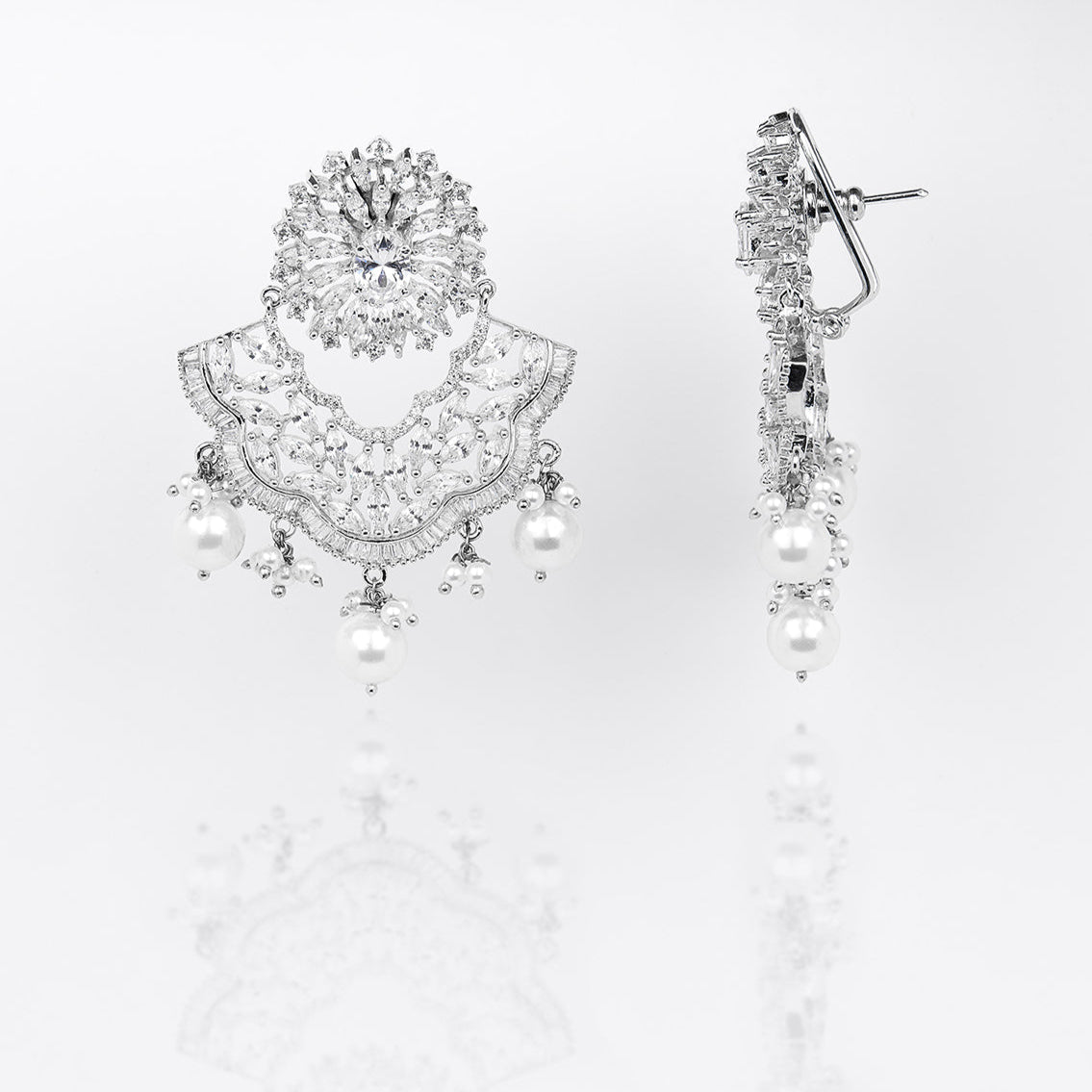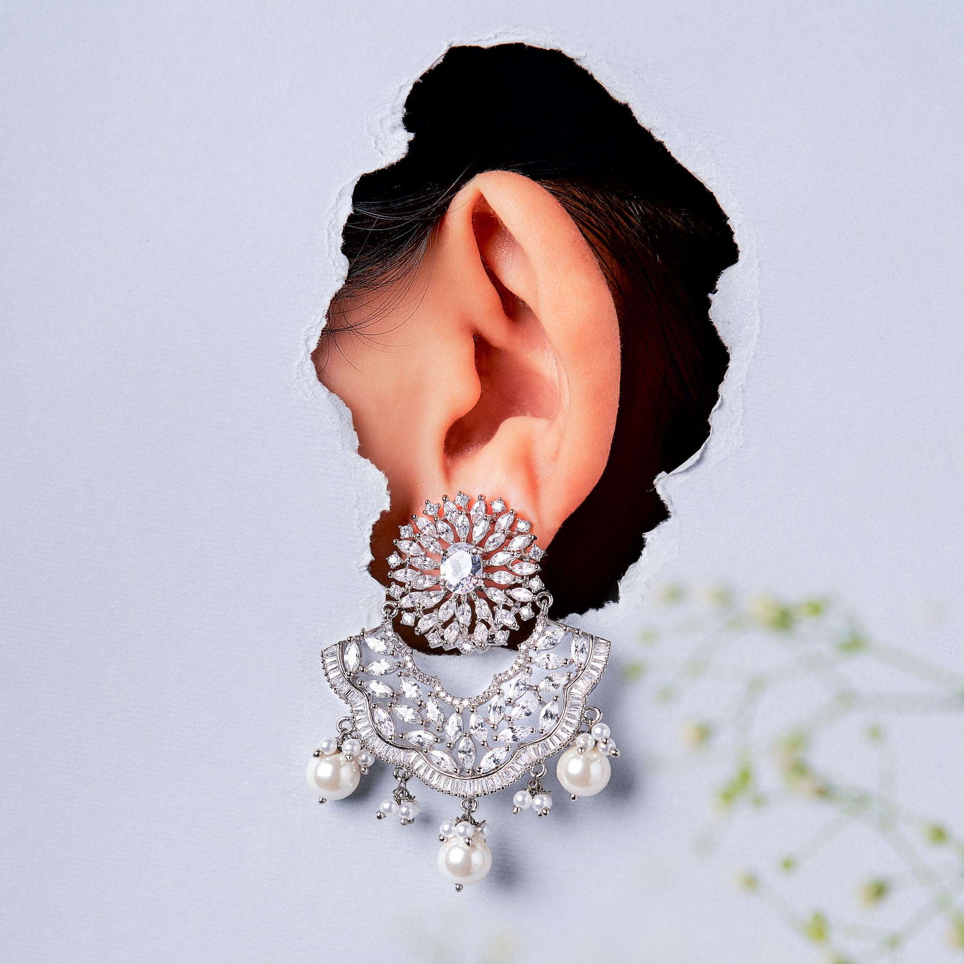 Simply too serene and dreamy with pearl drops these perfectly sized dazzling diamante chandbalis are perfect if you are a minimal person. Made with the finest zirconia stones, shell pearls, finished with silver rhodium plating and handcrafted with love in India.