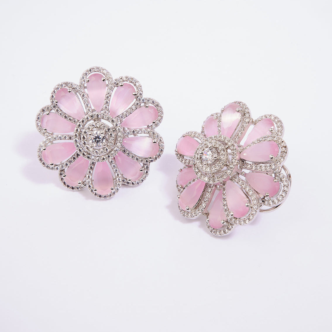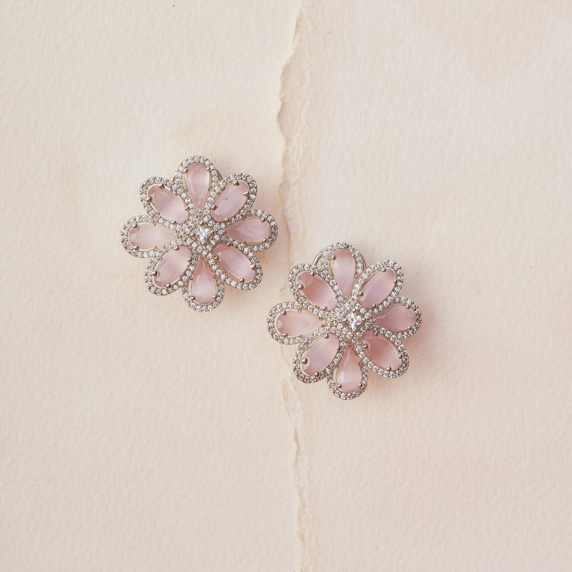 Designed with a concept of ancient royal English look in rose pink, these statement faux diamante earrings are a perfect versatile pair of additions to any jewellery kitty. Made with the finest zirconia stones, finished with silver rhodium plating and intricately handcrafted with love in India.