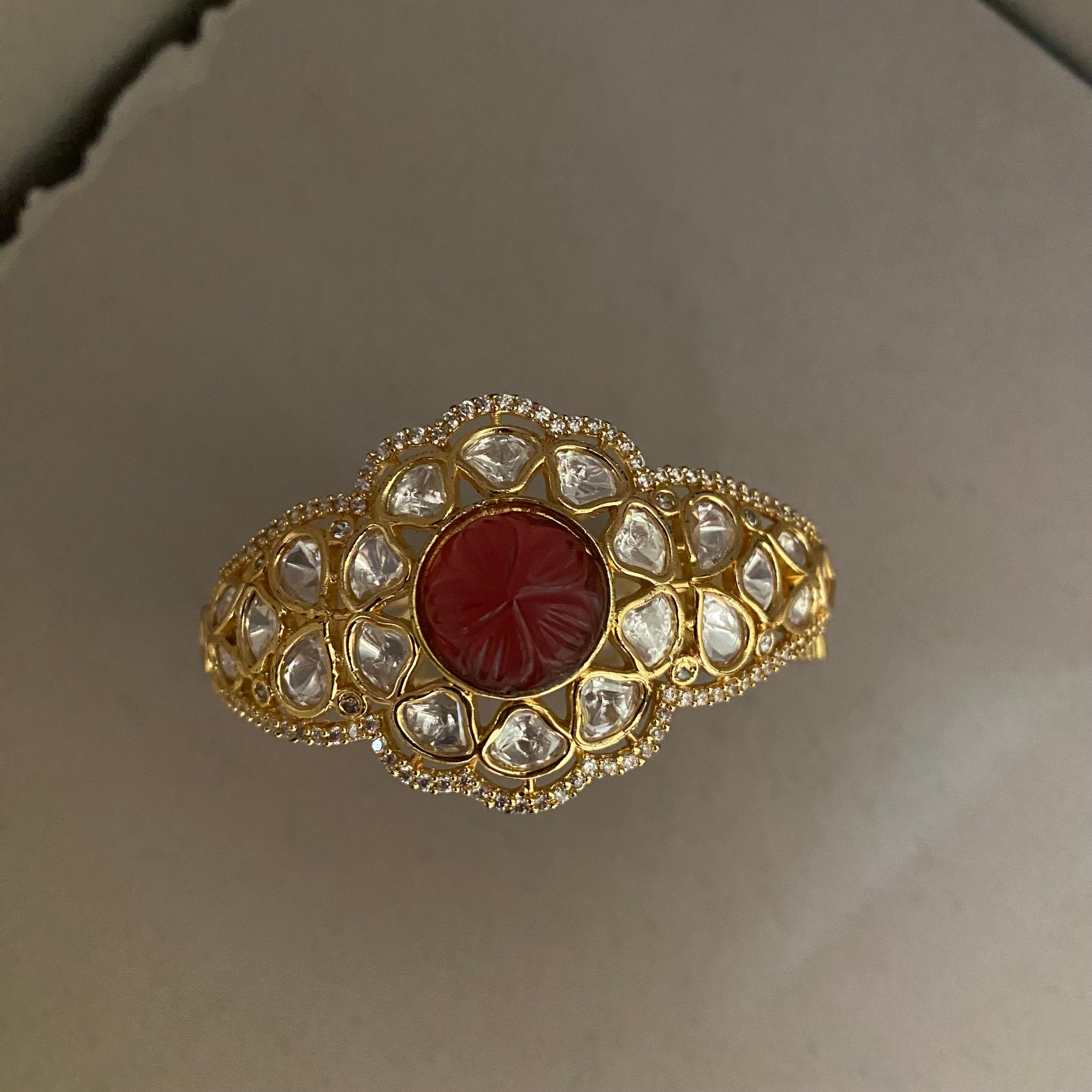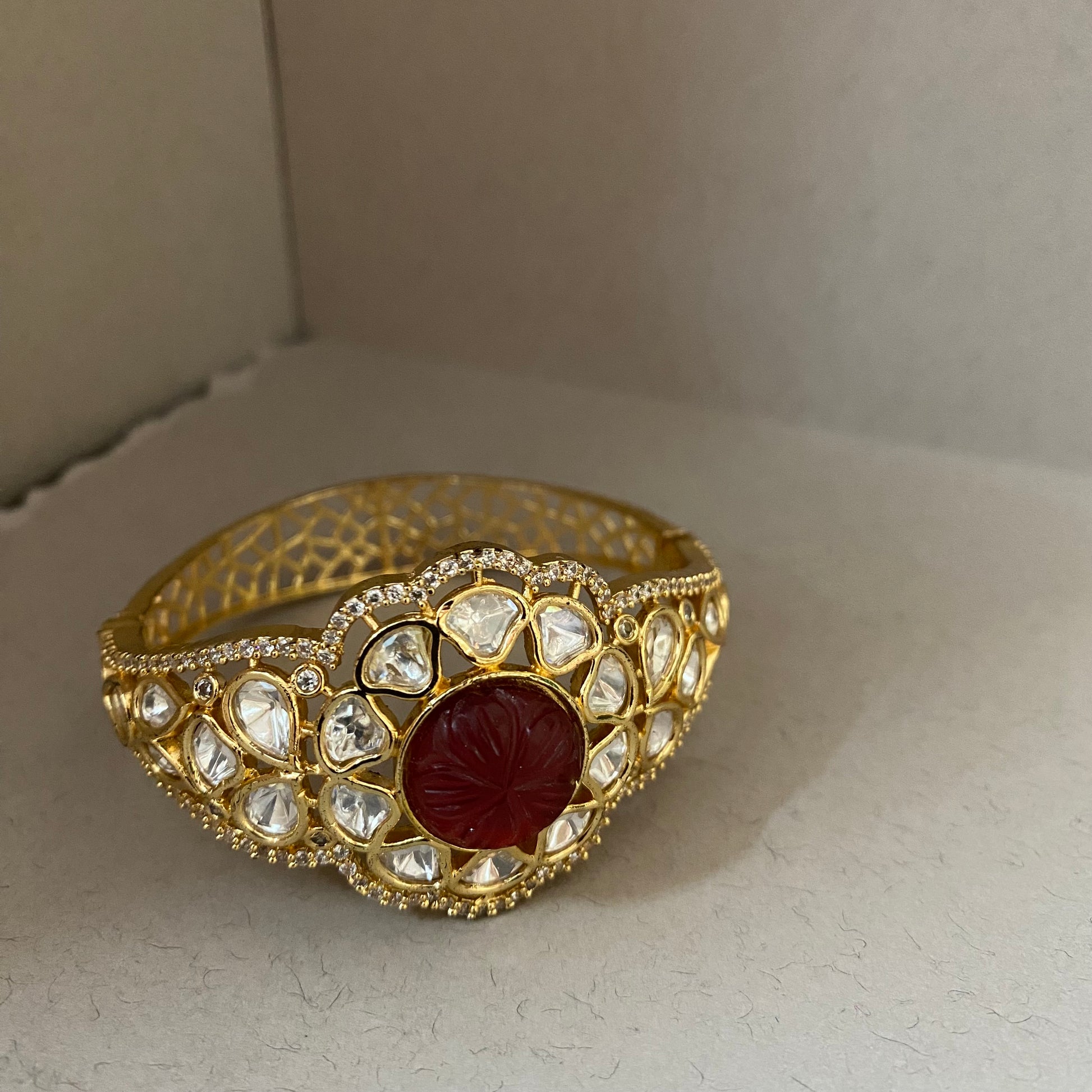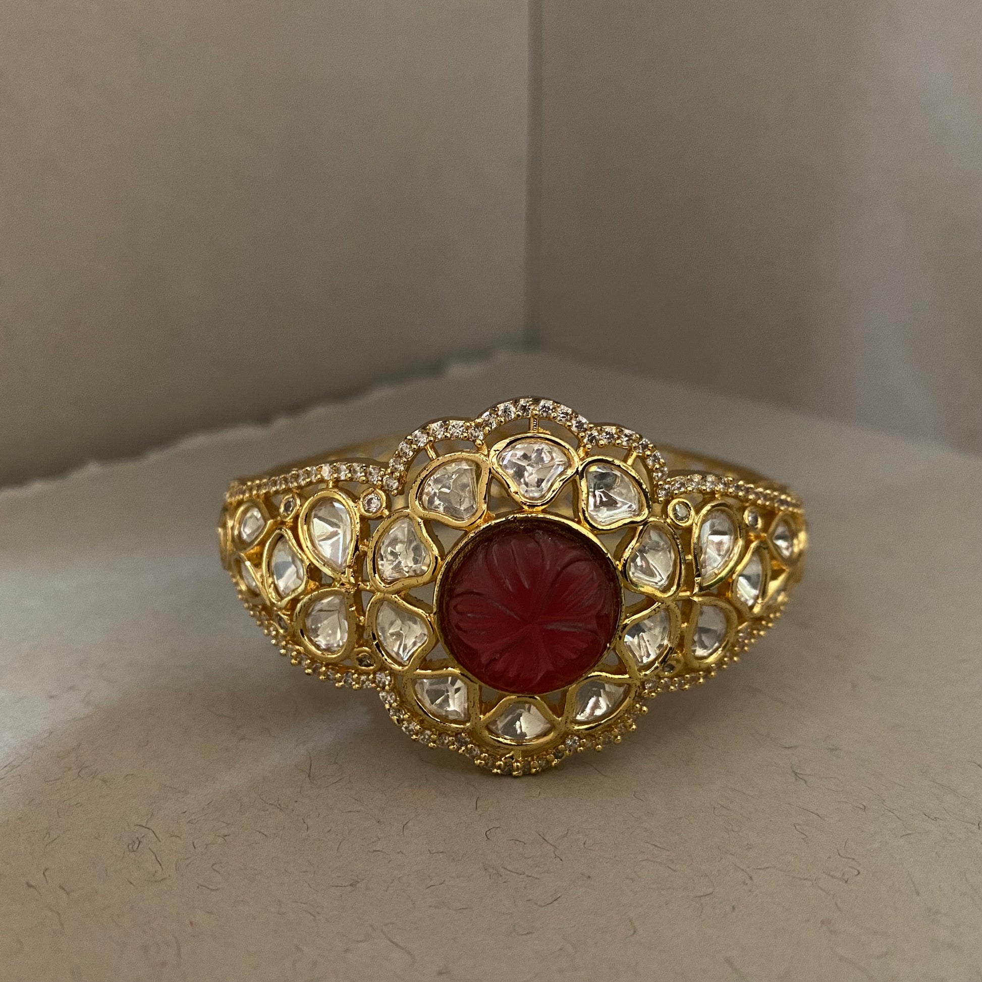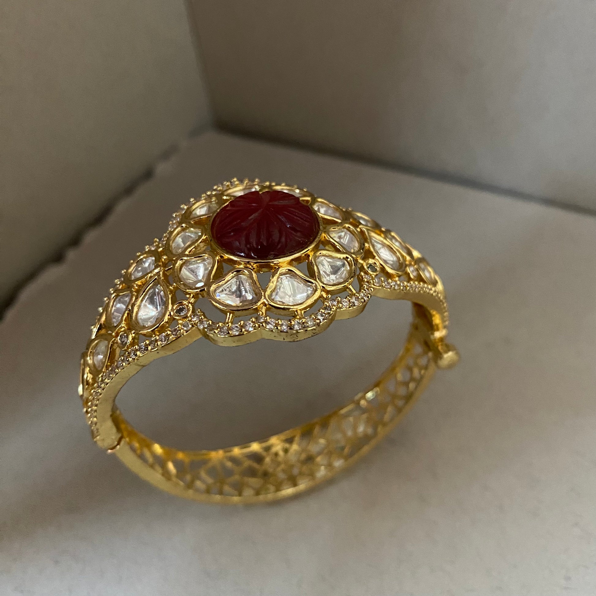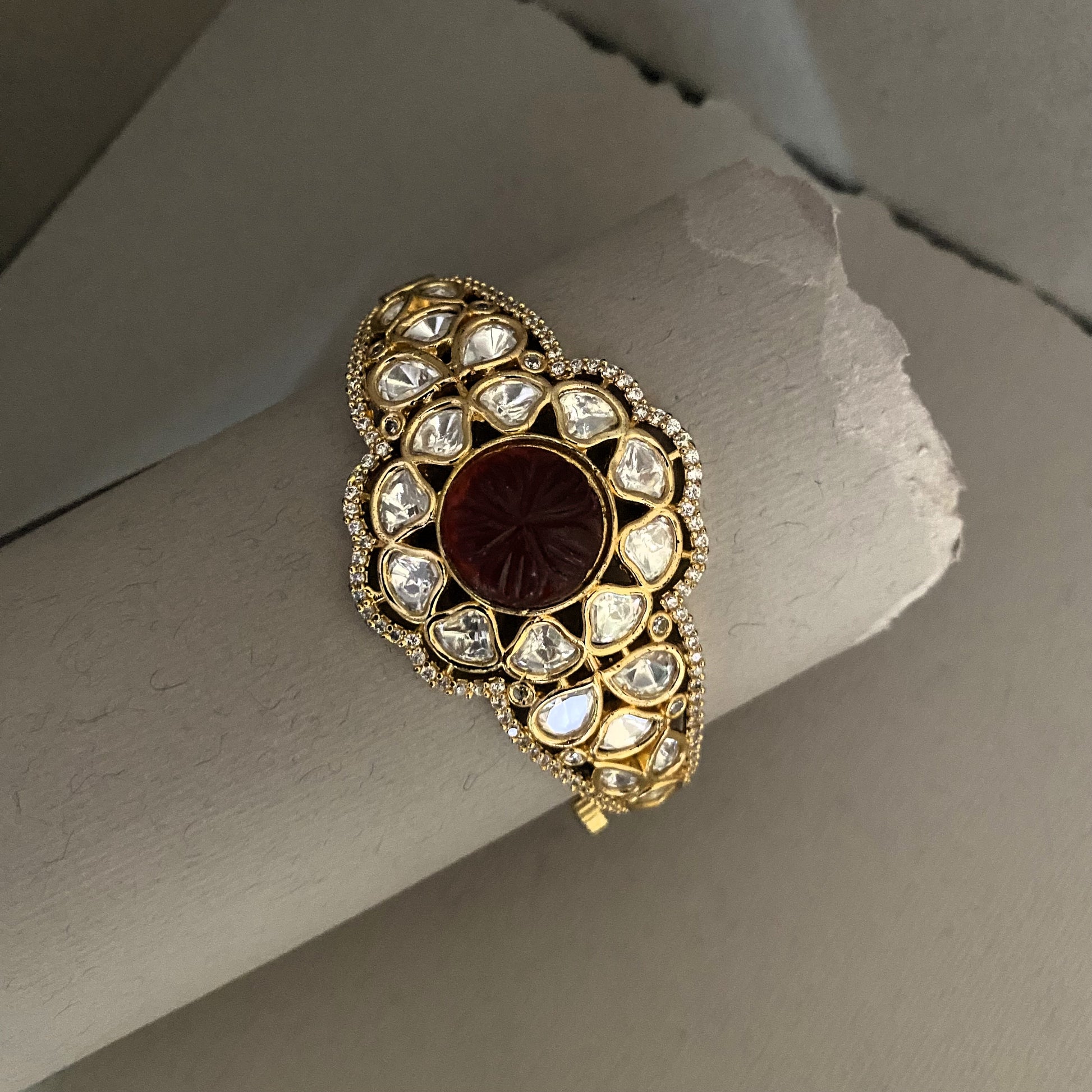 Adorn your wrist with regal elegance, featuring a big intricately carved ruby stone and uncut Kundan pieces, crafted with precision in Jaipur. This stunning, lightweight kada combines traditional beauty with modern convenience, secured with a comfortable screw fastening.