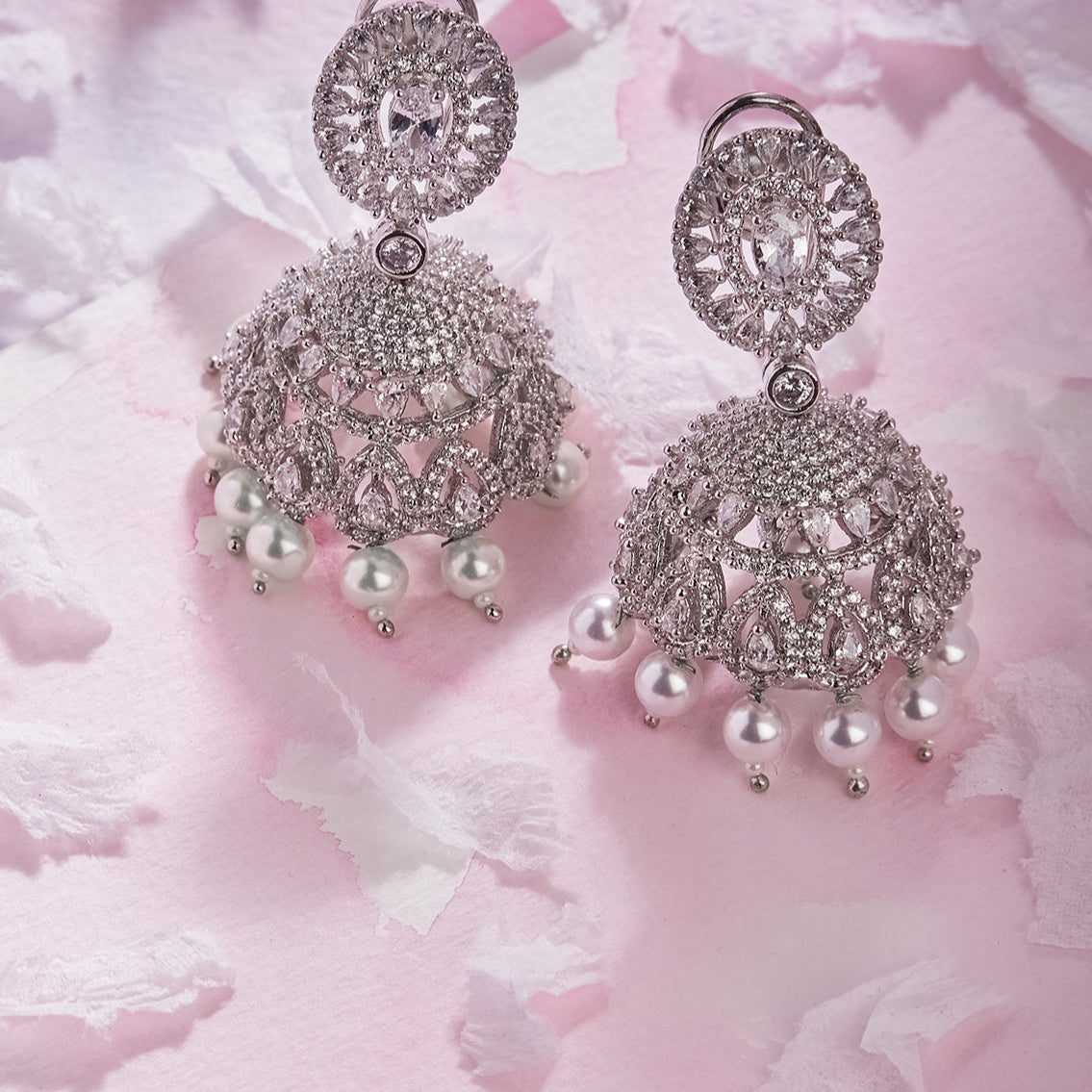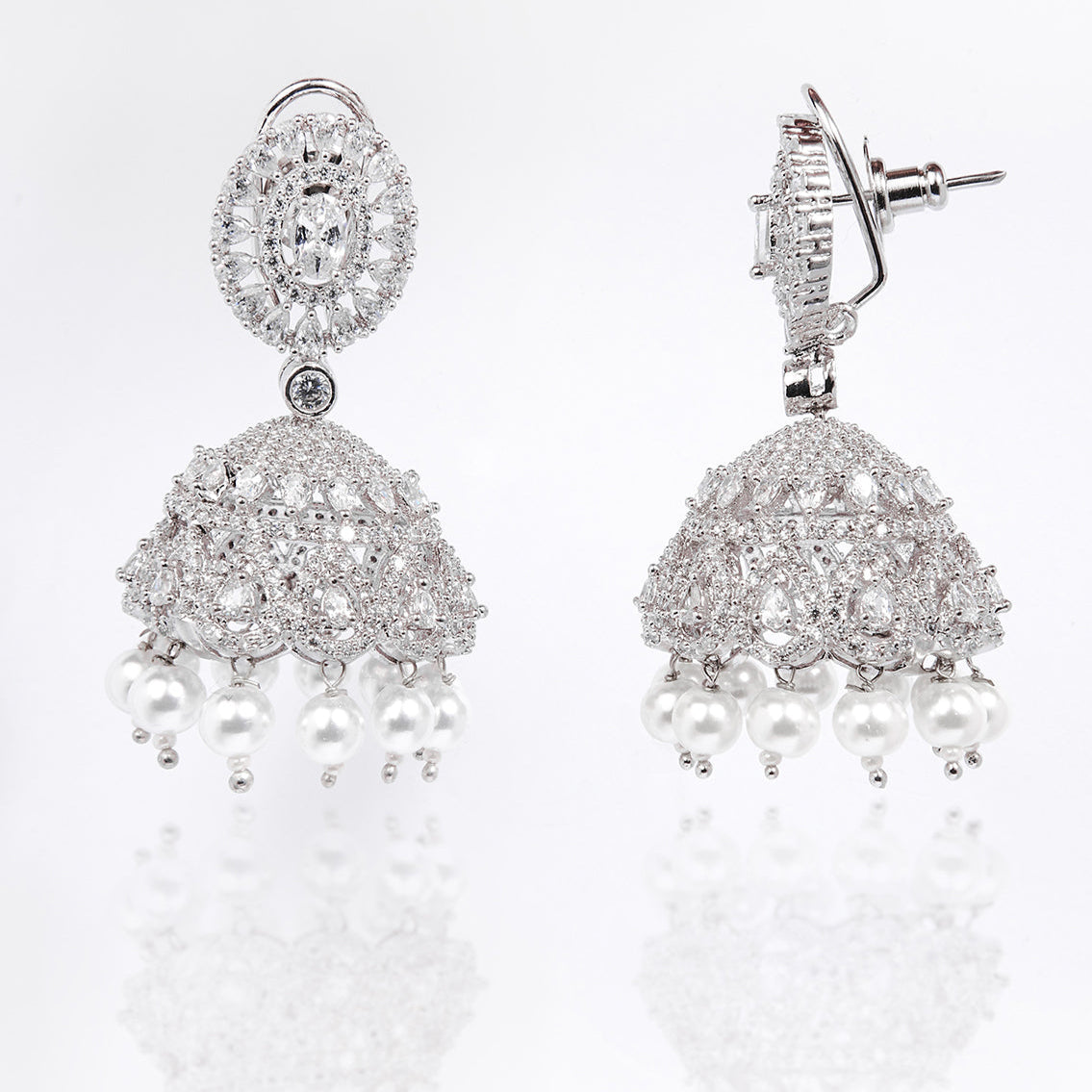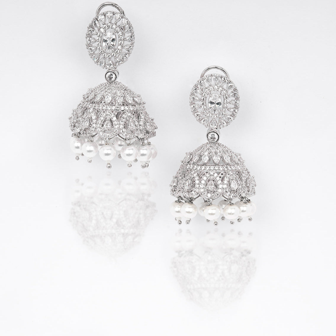 Simply put these jhumkas are breathtaking, with every detail carefully considered and executed to perfection. The sparkling white pearls adds the perfect amount of Indianness to these. Made with the finest zirconia stones, shell pearls, finished with silver rhodium plating and handcrafted with love in India.