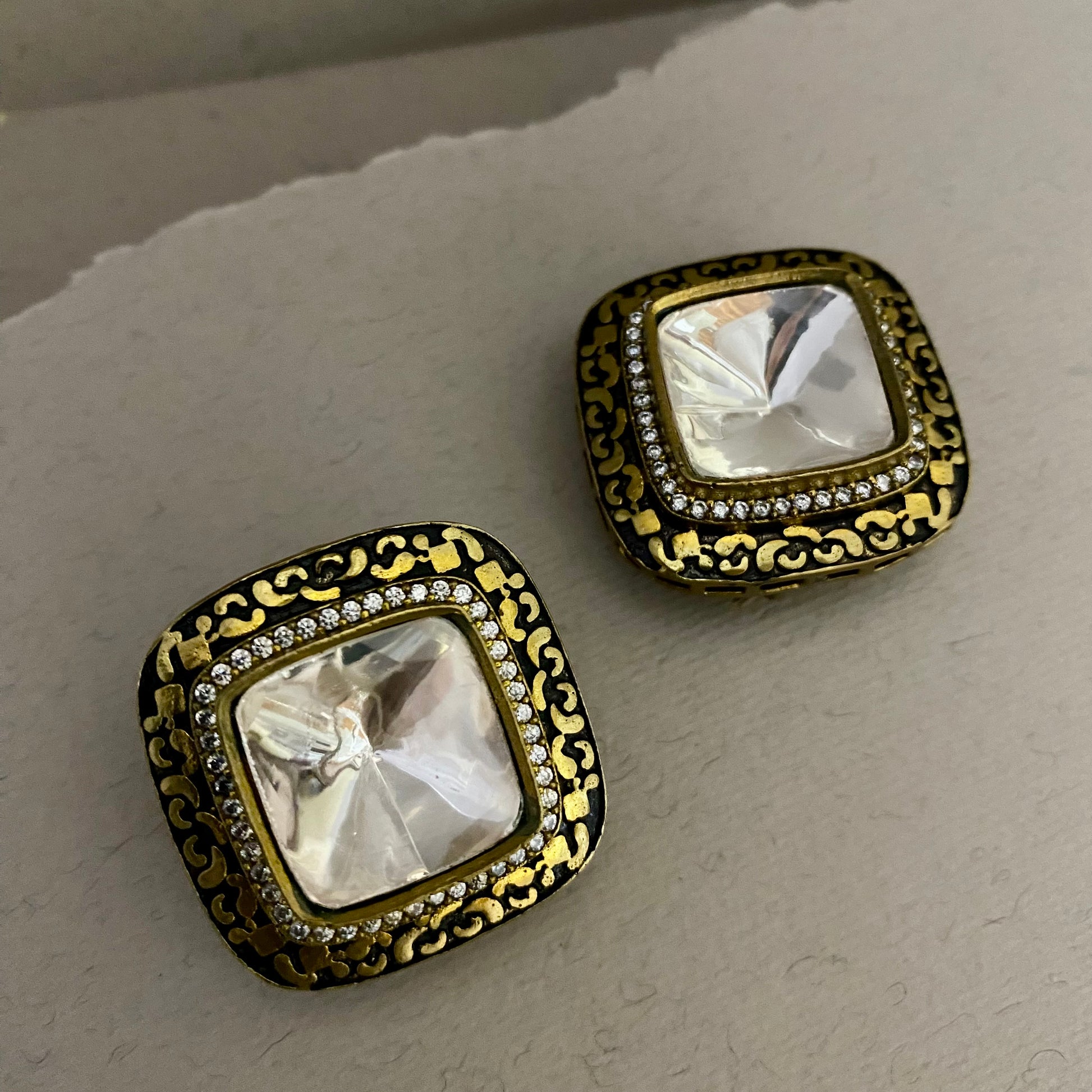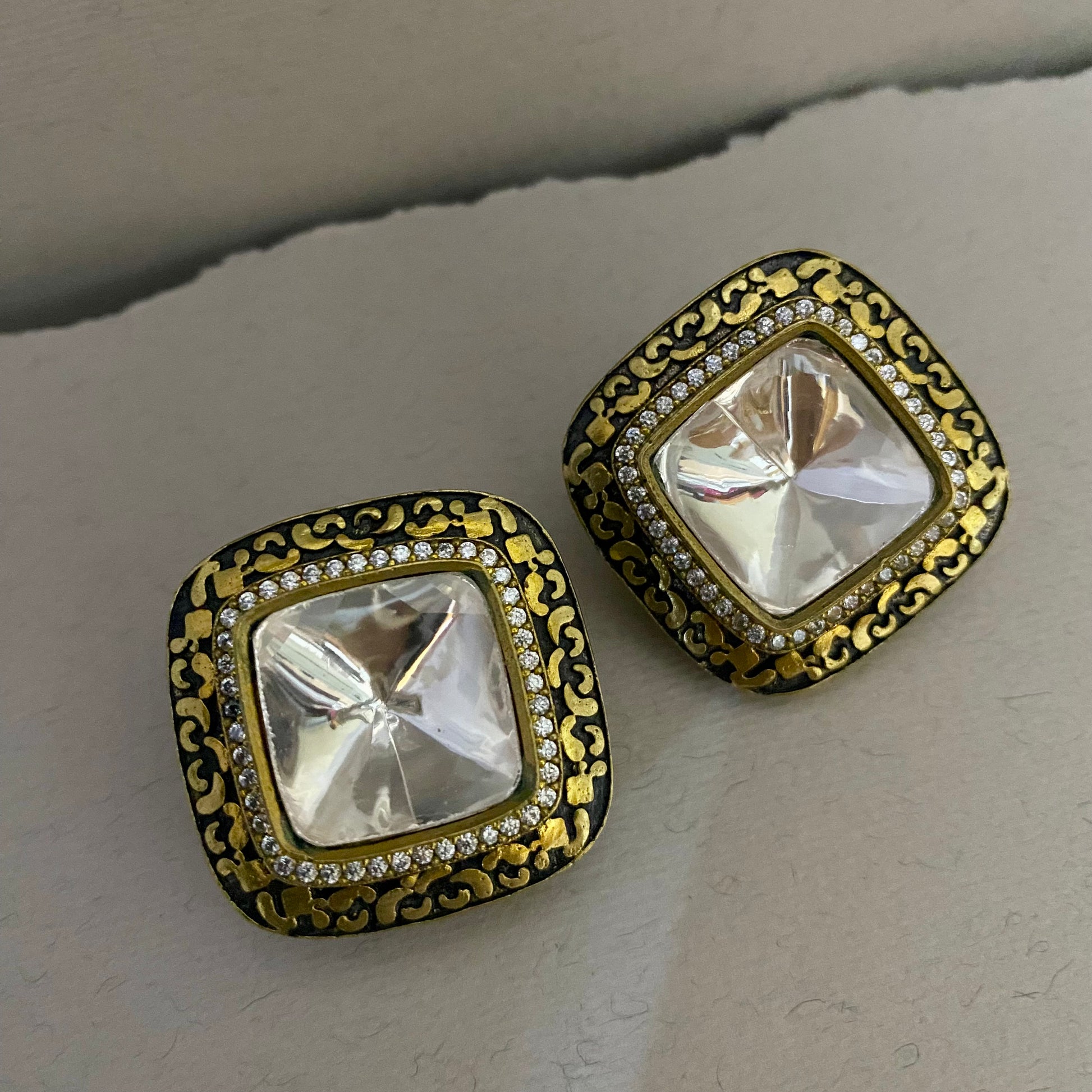 These square shaped large uncut Moissanite Polki studs, handcrafted in Jaipur with subtle black enamel accents, offer an elegant and understated design. Their lightweight construction ensures comfort and versatility, making them suitable for various occasions.