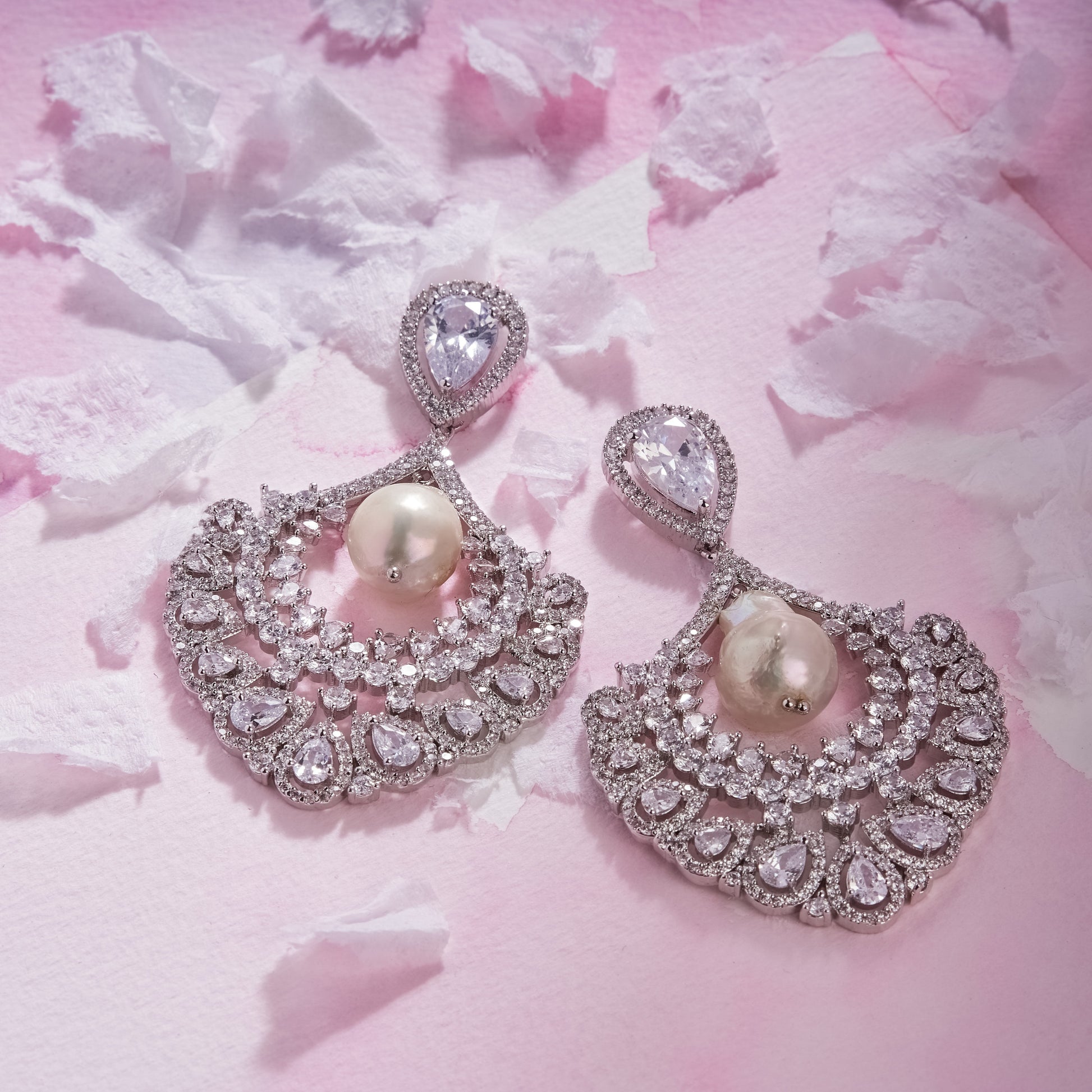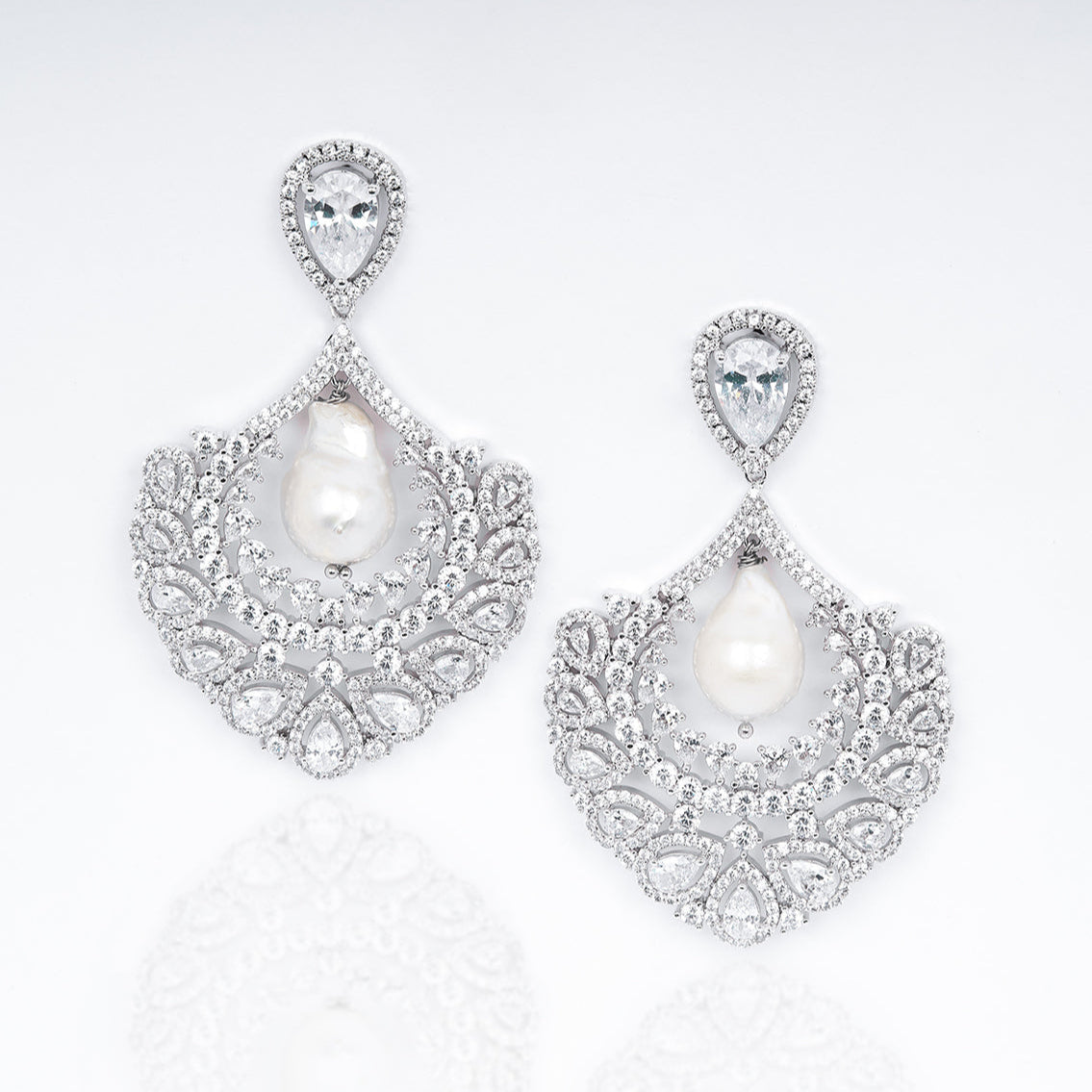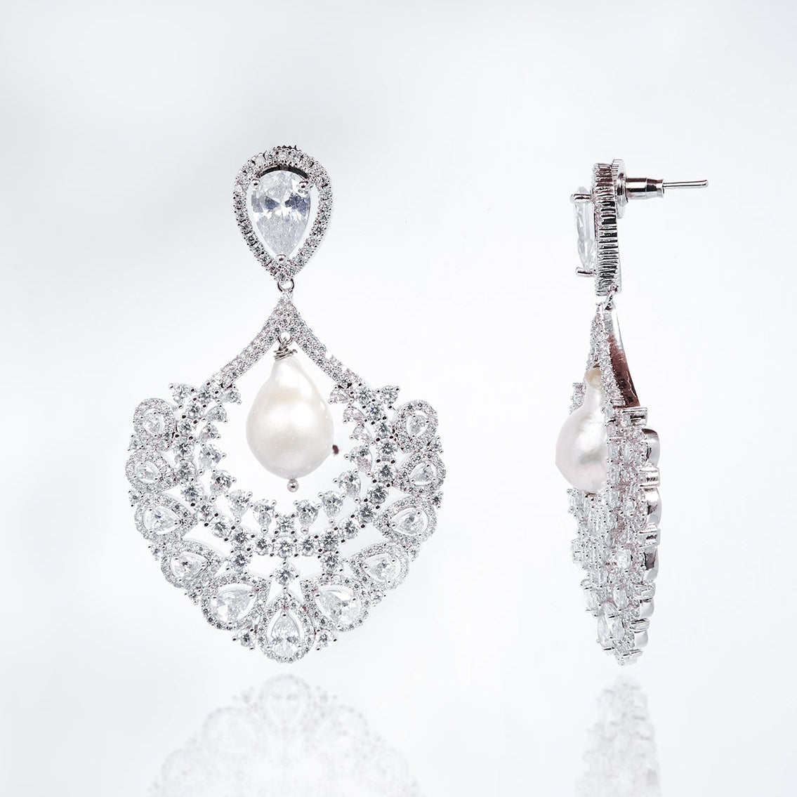 The peacock feather concept earrings in silver with natural baroque pearl drops simply exudes elegance and grace. The intricate design adds a touch of sophistication and luxury. Made in finest of zirconia stones, finished with white rhodium plating, handcrafted with love in India.