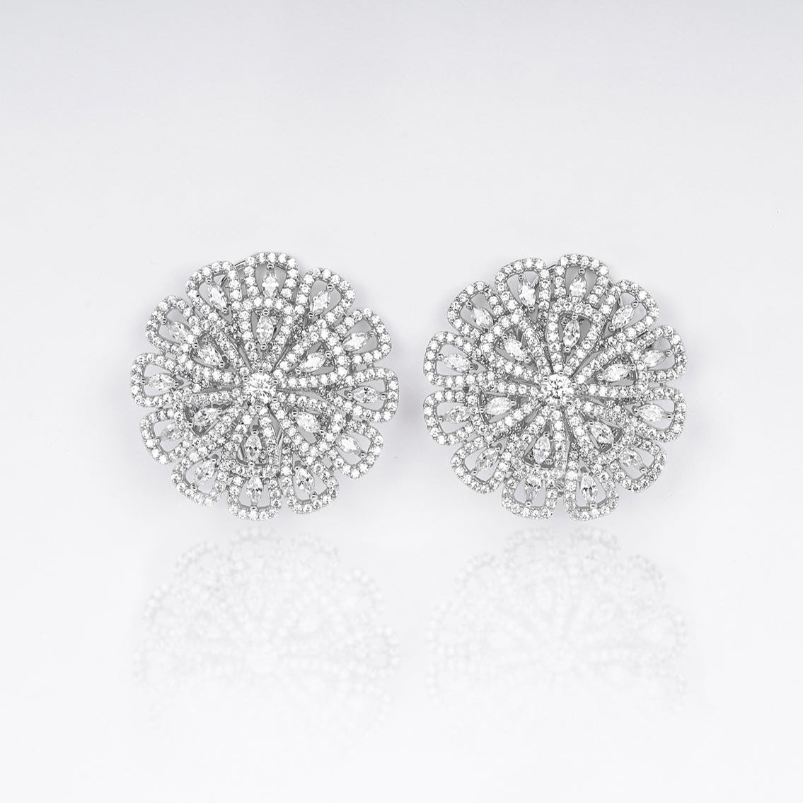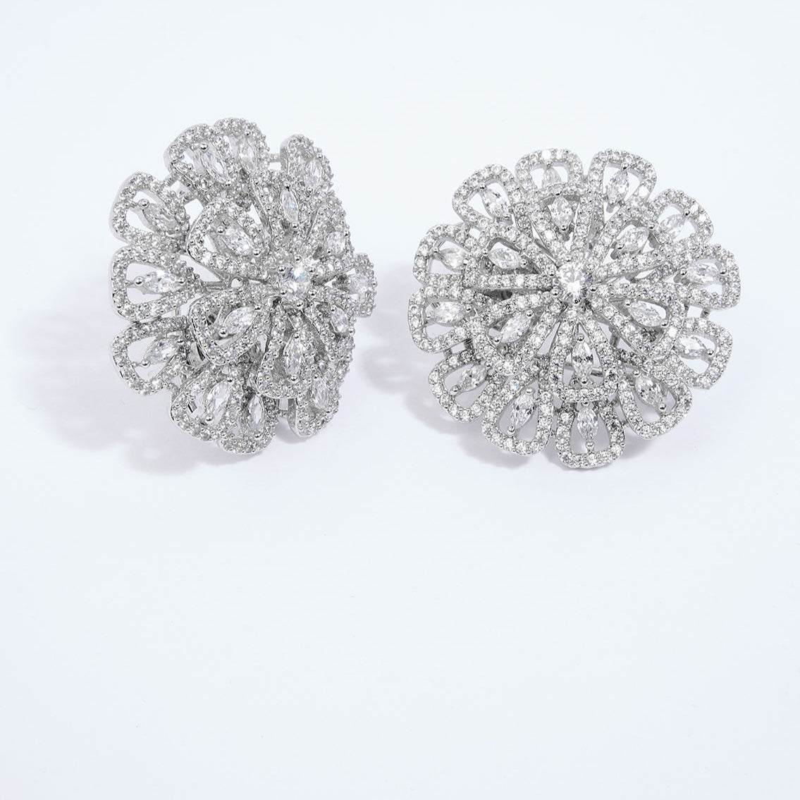 Add dash of elegance to your outfit with our oversized hydrangea flower style stud earrings. Handcrafted in India with mixed metals and finished with white rhodium plating, our earrings are the perfect accessory for any occasion.