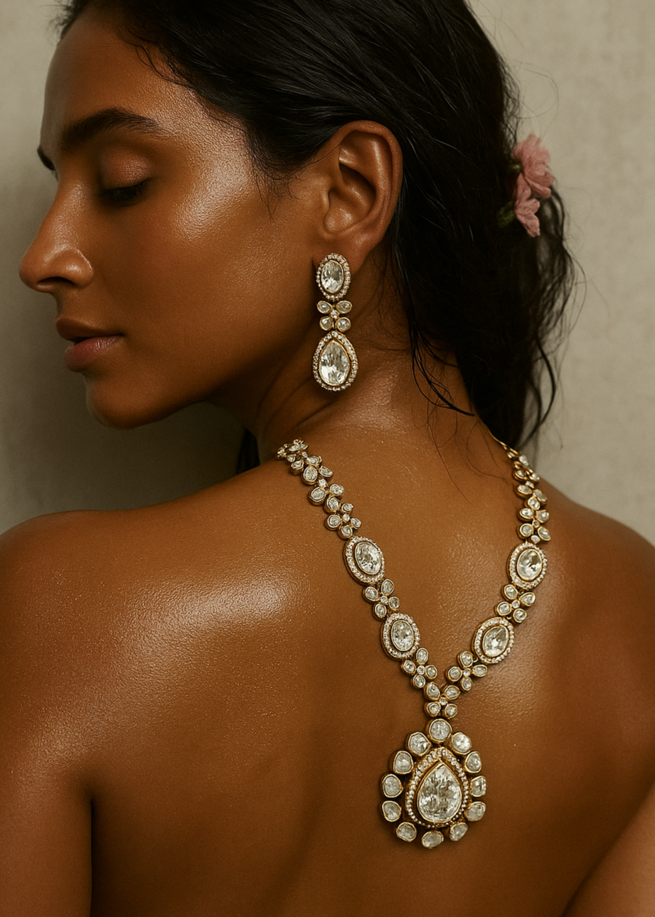 Gracefully crafted in moissanite polkis with a 52-micron gold plating on mixed metal, this necklace blends modern minimalism with timeless Indian elegance. Its versatile design, inspired by the grandeur of the royal era, makes it a piece that transcends age and occasion.
