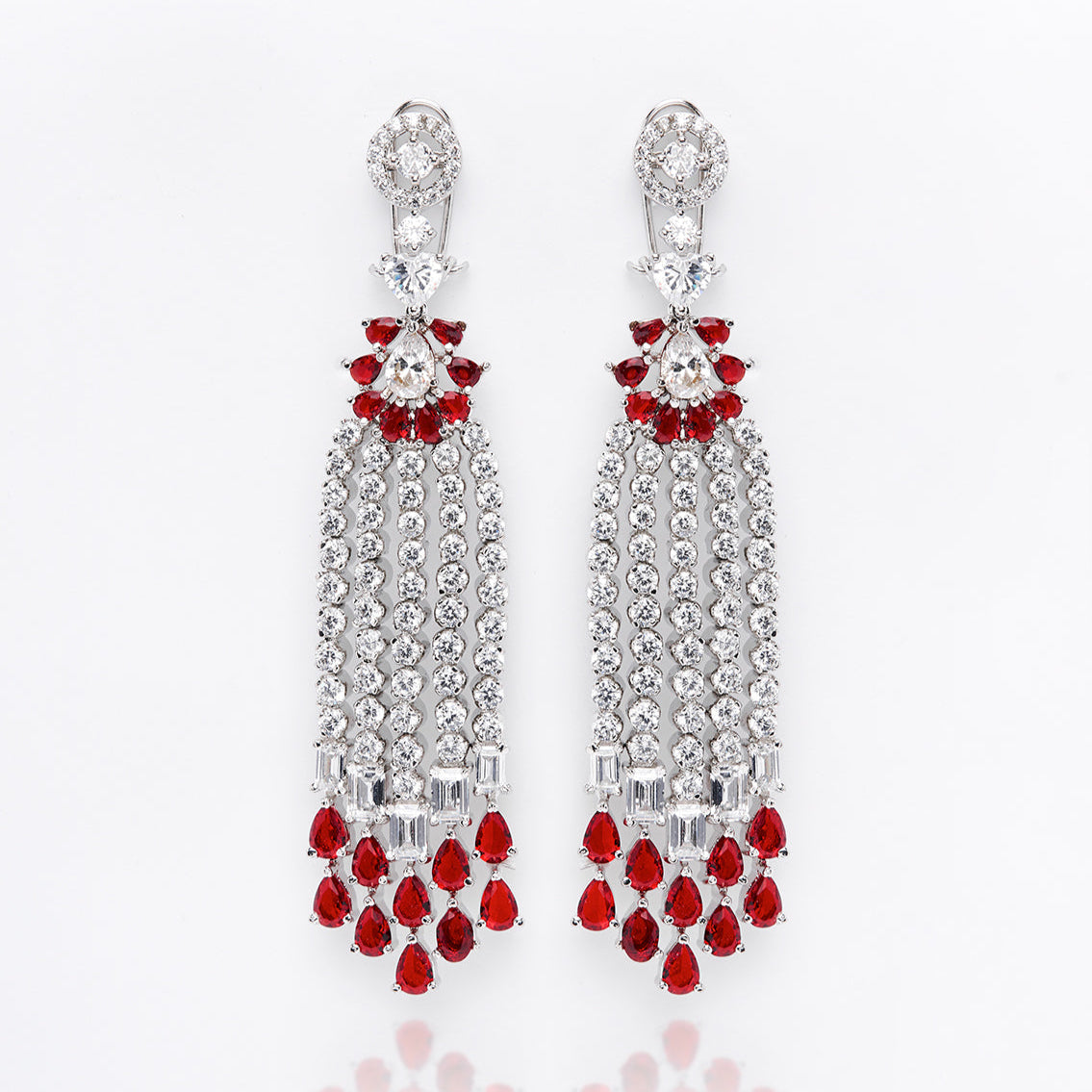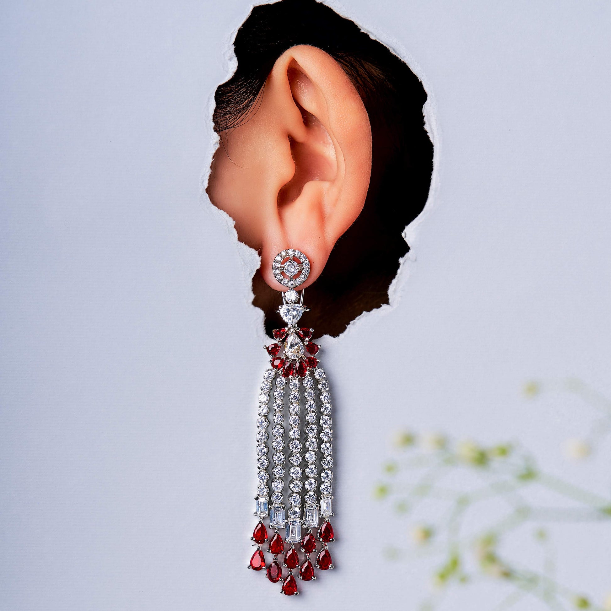 Truly love at first sight ! These long fall earrings features diamond strings cascading in a mesmerizing waterfall design, interspersed with vibrant rubies. Together, they create a symphony of immeasurable beauty and strength, capturing both elegance and power in every movement.