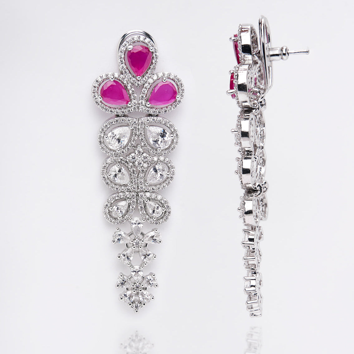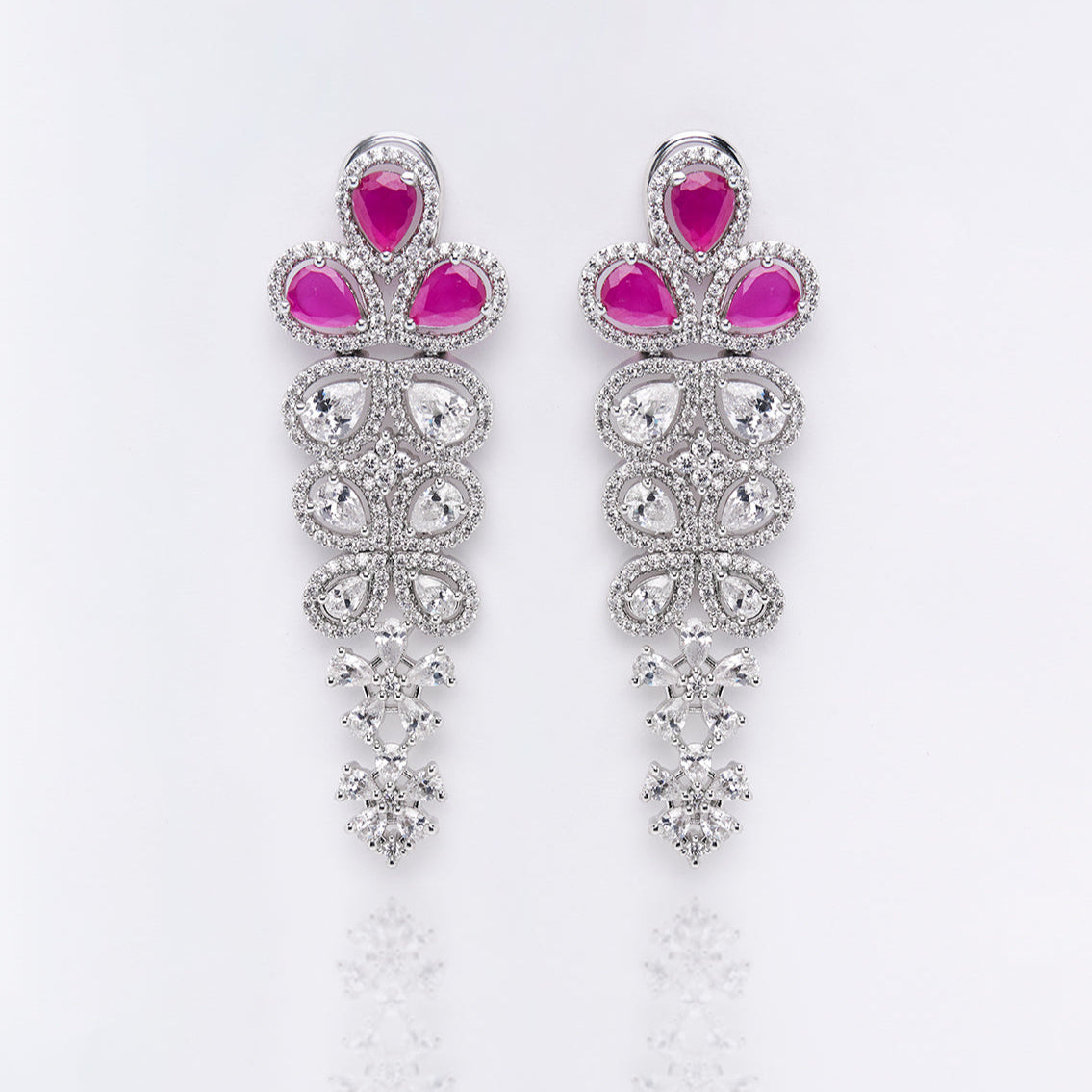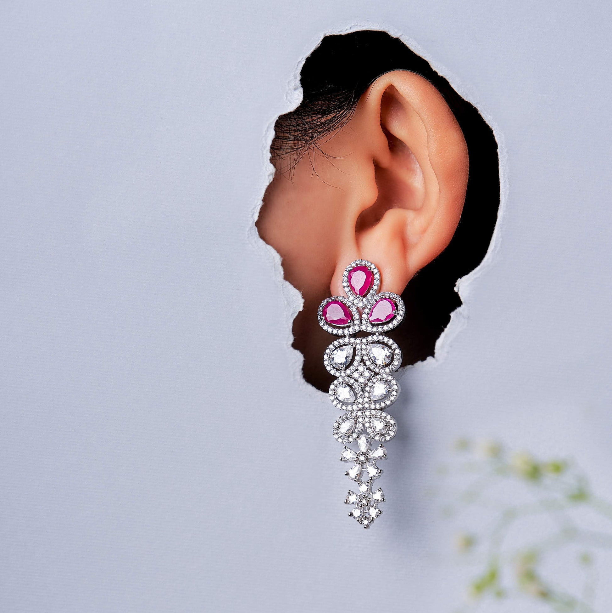 Experience sophistication with our finely crafted, white rhodium plated leaf design earrings, handcrafted in India. The touch of ruby adds a pop of color and makes these earrings a must have accessory for any occasion.